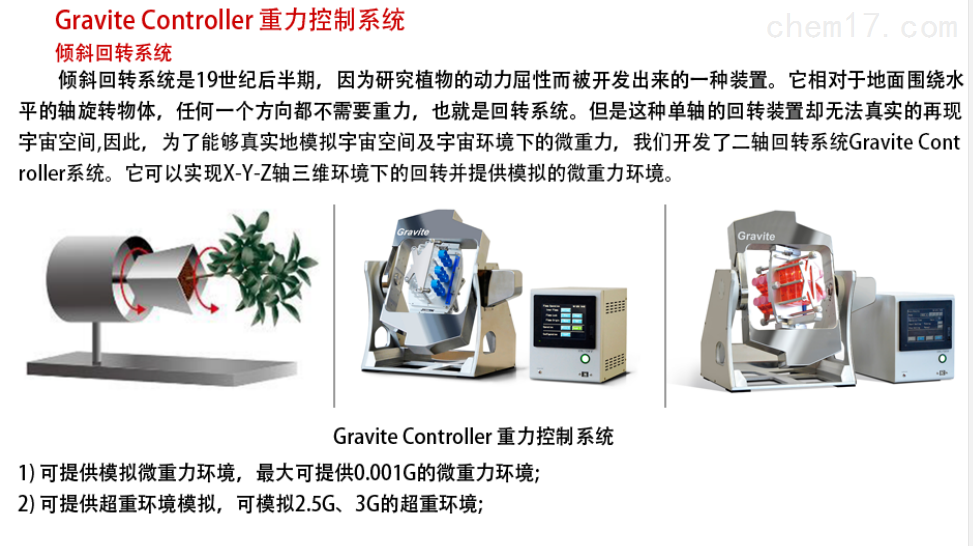 Gravite®是一种多向G力发生器,可同时控制两轴的旋转。 这功能允许取消设备中心的累积重力矢量,以创建 与ISS(国际空间站)相同的 10 -3 g 微重力环境