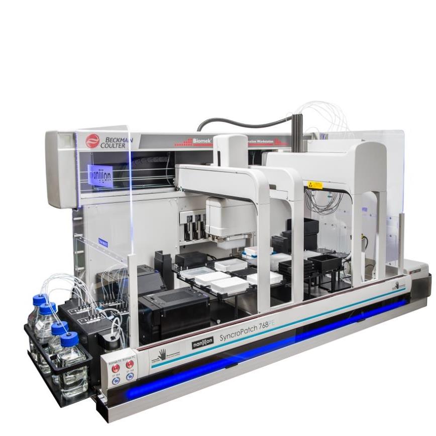SyncroPatch 384/768PE是第一款高质量高通量全自动膜片钳系统,是最有可能填补离子通道药物初次筛选与二次筛空白的设备。SyncroPatch 是由一个包含384个独立放大器的模块Patch Engine(PE),与384通道的移液系统 Biomek FXP 紧密整合设计的一个全自动药物筛选环境,硬件与软件都在行业药物研发企业进行测试以提供的真实高通量离子通道筛选性能。可在一个移液系统里整合最多两台PE模块与768独立放大器,实现768通道平行记录。也支持后期从 384 直接升级至 768通道记录。